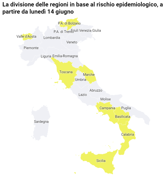 Emilia-Romagna, Lombardia, Lazio, Piemonte, Puglia e la Provincia autonoma di Trento 明天6月14号星期一都将进入白区。