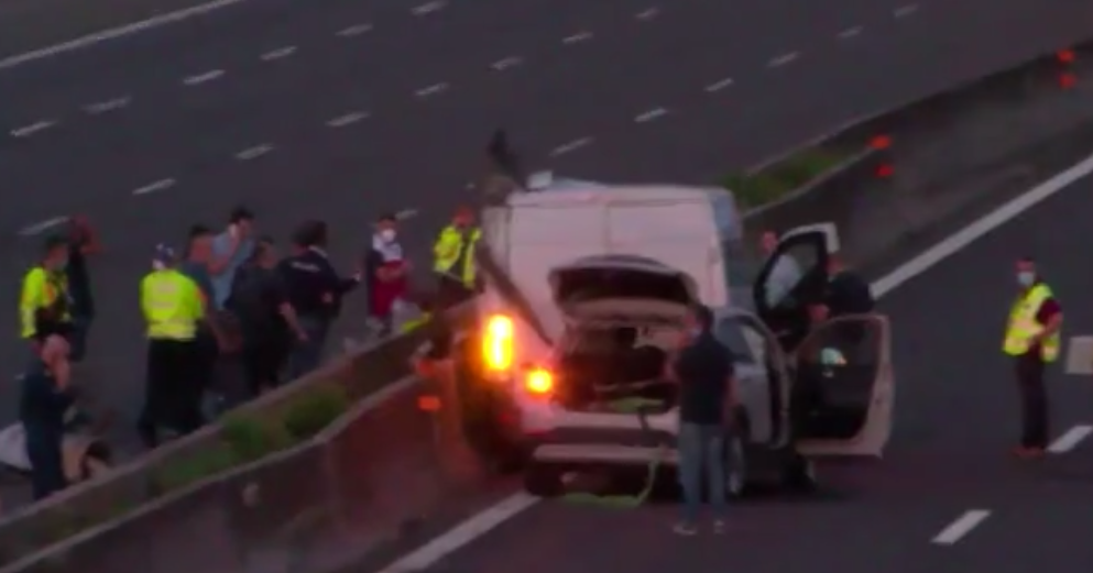 为了阻断交通,犯罪分子们在路面上洒满了钉子,然后他们把脸完全遮住,用武器胁迫两辆货车的司机把货车横着停在高速公路中间,并且点燃了7辆车,但在点火之前他们让车上的乘客全部下车。