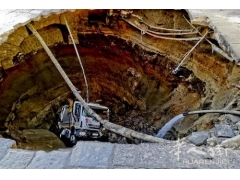 街道塌陷一辆垃圾车掉进深坑内