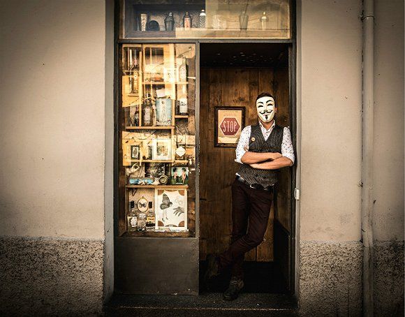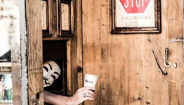 人们只需敲一敲门,戴着《V字仇杀队》中Guy Fawkes面具的调酒师便会出现。在外卖窗口中,你看不到调酒师的真容,除了一副面具遮挡之外,你只能看见他们的手