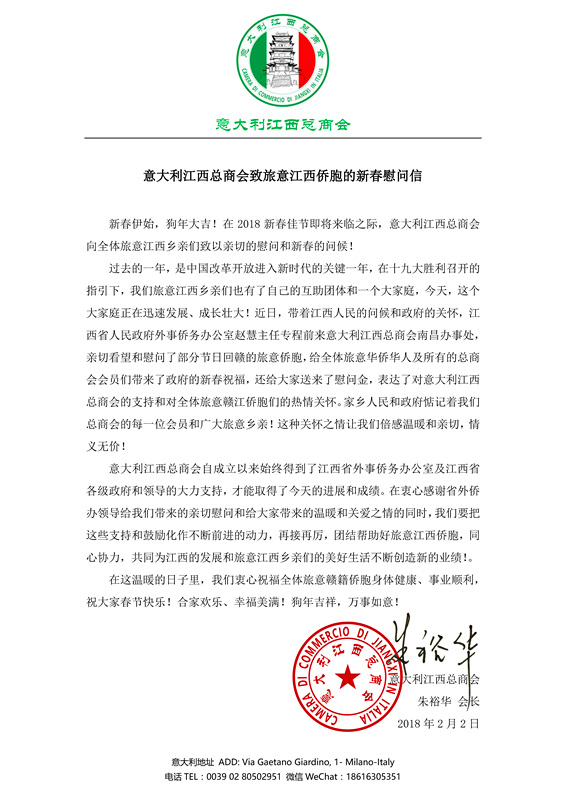 意大利江西总商会致旅意江西侨胞的新春慰问信