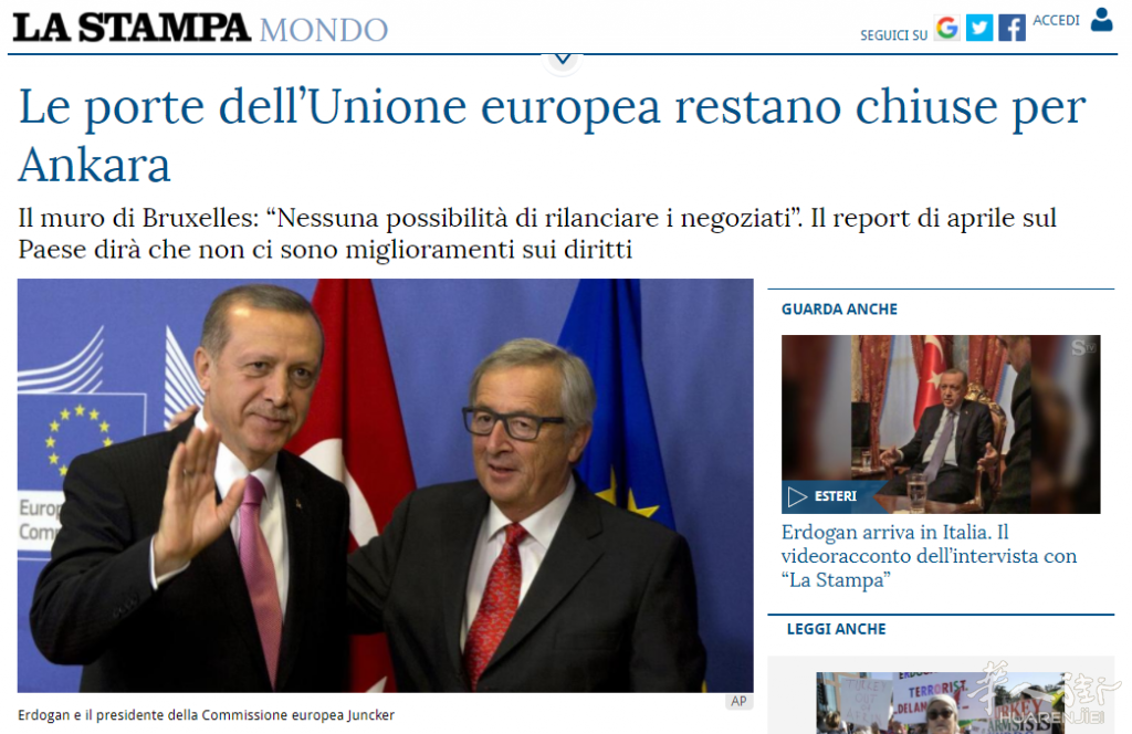 土耳其总统埃尔多安拒绝与欧洲联盟达成伙伴关系,坚称成为欧盟正式成员是土耳其的唯一选项。 埃尔多安接受意大利《LA STAMPA》访问时说,欧盟必须“遵守其对土耳其的承诺”。
