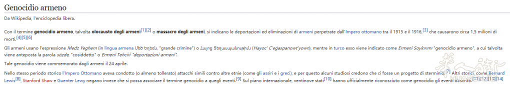 亚美尼亚种族大屠杀指土耳其政府于1915年至1917年间,对其辖境内亚美尼亚人进行的种族屠杀。其受害者数量达到150万之众。 土耳其政府至今拒绝承认这是一次官方发起的有预谋的屠杀行为,但亚美尼亚、俄罗斯和其他多数西方国家皆认为这是一件可以和犹太人大屠杀相提并论的由一国政府蓄意进行的种族灭绝行为,一些土耳其学者(如奥尔汗·帕穆克等)也持有相同观点。目前共有阿根廷、比利时、加拿大、德国、法国、希腊、意大利、黎巴嫩、荷兰、俄罗斯、瑞典等廿多个国家官方承认这是一场种族屠杀。欧洲议会也承认“亚美尼亚大屠杀”事件,认为这宗屠杀为“违反人性的罪行”。联合国防止歧视和保护少数小组委员会也将事件定性为“种族灭绝”。土耳其政府拒不承认,就有点像日本死不承认南京大屠杀一样。德国法国两位欧盟大佬坚决抵制否认亚美尼亚大屠杀,并且视为犯罪。
