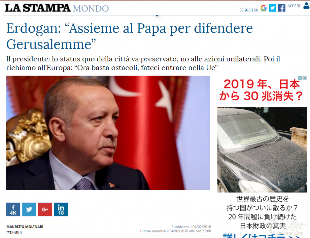 街友们,大家好~!近日意大利媒体重点报道的事件莫过于土耳其总统埃尔多安(Recep Tayyip Erdogan)于近日访问意大利,并拜会梵蒂冈教宗方济各(Pope Francis),双方就耶路撒冷问题进行沟通,被接受意大利媒体专访。